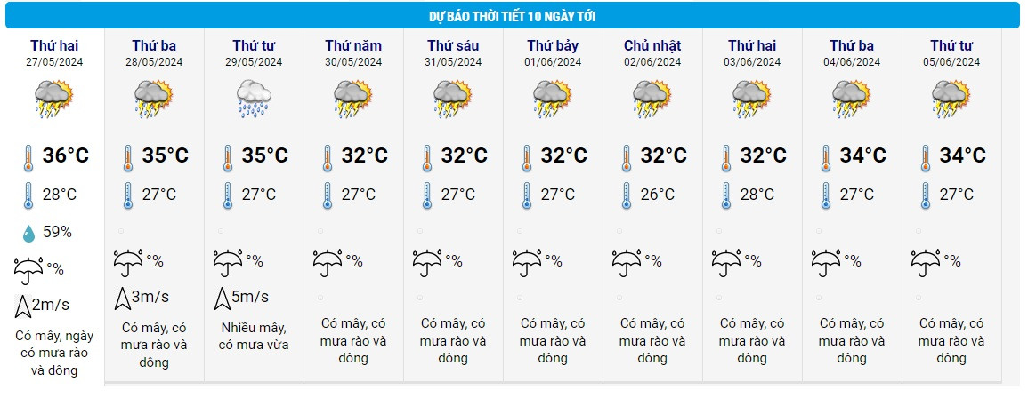 Có mây, chiều tối và đêm có mưa rào và giông vài nơi; ngày nắng nóng. Gió đông nam đến nam cấp 2-3. Trong mưa giông có khả năng xảy ra lốc, sét và gió giật mạnh.