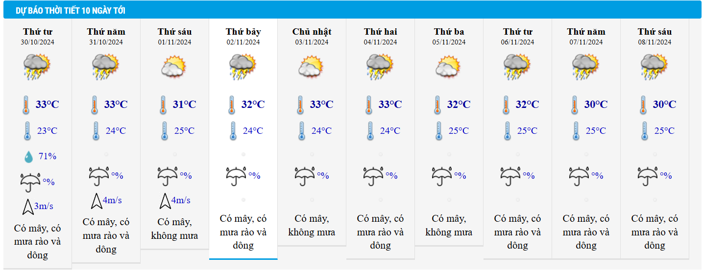 Có mây, có mưa rào và giông rải rác (tập trung vào chiều và tối). Gió tây nam cấp 2-3. Trong mưa giông có khả năng xảy ra lốc, sét và gió giật mạnh.