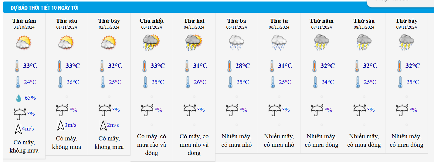 Có mây, ngày nắng, chiều và tối có mưa rào rải rác và có nơi có giông, đêm có mưa rào và giông vài nơi. Gió tây nam cấp 2-3. Trong mưa giông có khả năng xảy ra lốc, sét và gió giật mạnh.