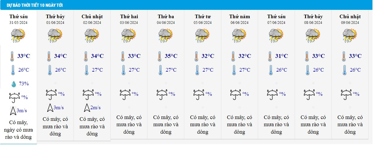 Có mây, ngày nắng, chiều và tối có mưa rào và giông rải rác, cục bộ có mưa to, đêm có mưa rào và giông vài nơi. Gió tây nam cấp 2-3. Trong mưa giông có khả năng xảy ra lốc, sét, mưa đá và gió giật mạnh.