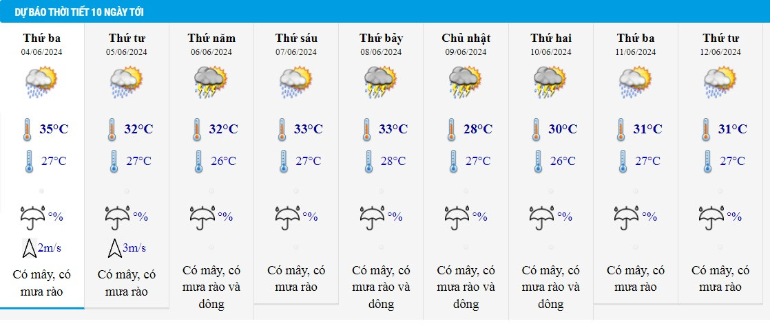 Có mây, chiều tối và đêm có mưa rào và giông vài nơi; ngày nắng nóng, có nơi nắng nóng gay gắt. Gió tây nam cấp 2-3. Trong mưa giông có khả năng xảy ra lốc, sét, mưa đá và gió giật mạnh.