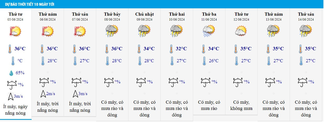 Có mây, chiều tối và đêm có mưa rào và giông vài nơi; ngày nắng nóng, có nơi nắng nóng gay gắt. Gió tây nam cấp 2-3. Trong mưa giông có khả năng xảy ra lốc, sét, mưa đá và gió giật mạnh.