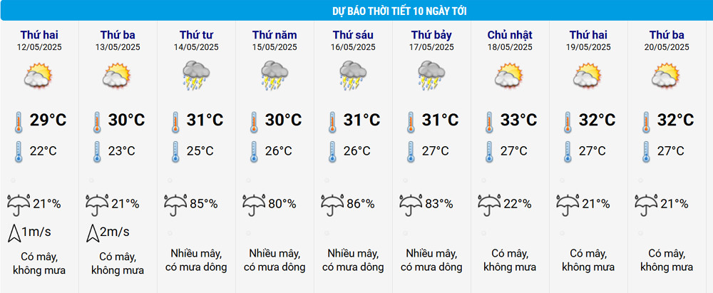 - Ngày 11-13/5: Mưa rải rác đến nhiều nơi, có nơi mưa to đến rất to. Nhiệt độ cao nhất 32-34 độ, thấp nhất 24-25 độ.