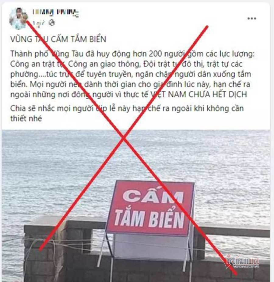 Trên facebook cá nhân, tài khoản này đăng tải nội dung: “Thành phố Vũng Tàu đã huy động hơn 200 người gồm các lực lượng Công an trật tự, Công an giao thông, Đội trật tự đô thị… để tuyên truyền, nhắc nhở, ngăn chặn người dân xuống tắm biển… Đính kèm bài viết có một số hình ảnh về lực lượng chức năng TP Vũng Tàu đang làm nhiệm vụ tại khu vực bãi Trước.