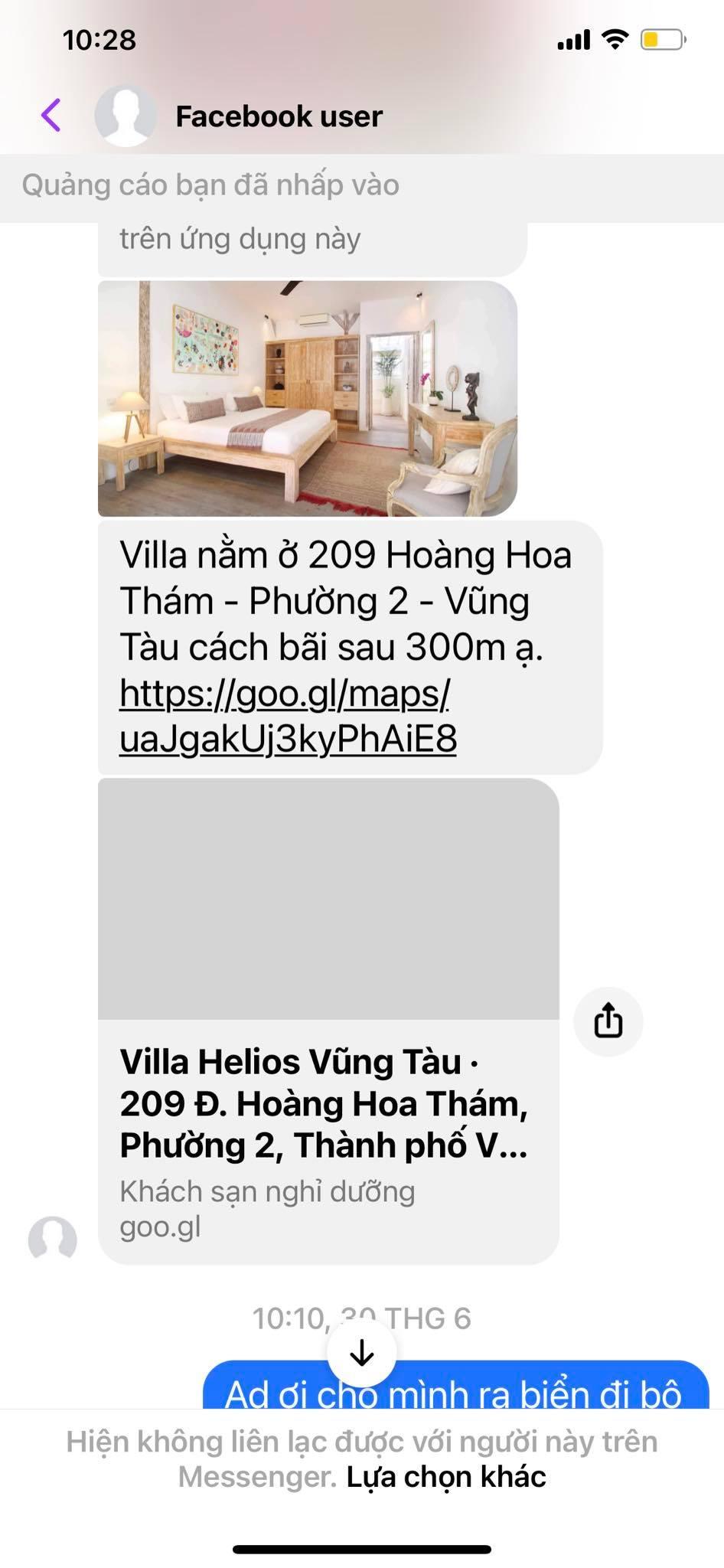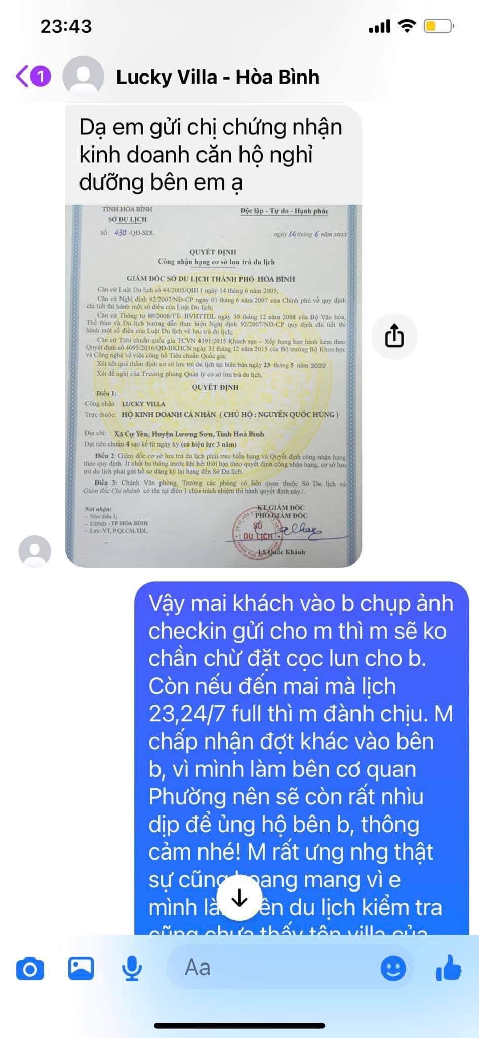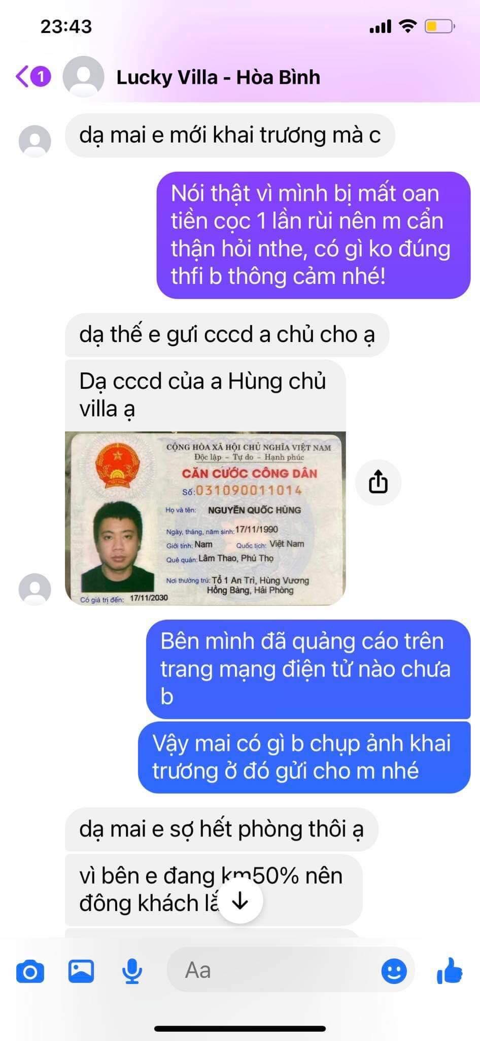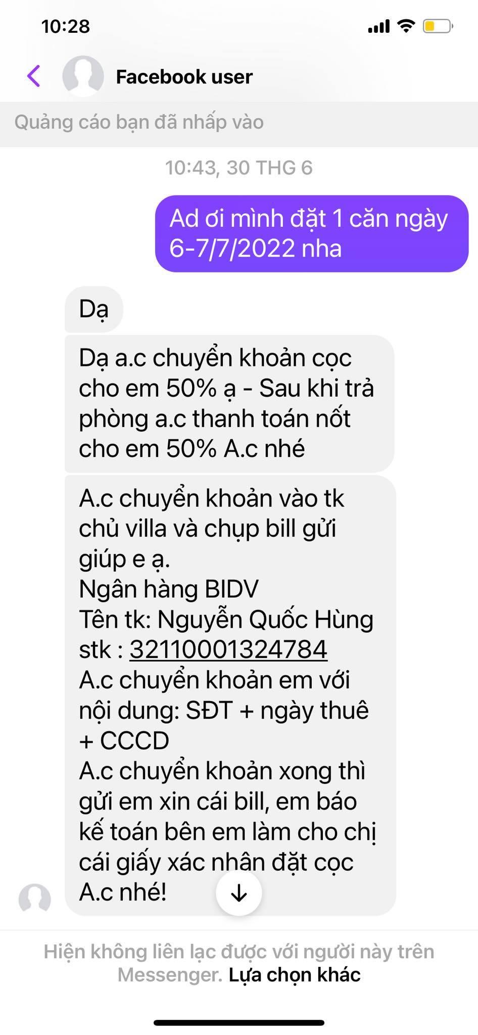 Tư vấn viên của fanpage nhanh chóng đưa thông tin giới thiệu căn biệt thự, chương trình ưu đãi, gửi hình ảnh biệt thự, căn cước công dân của chủ biệt thự, quyết định công nhận hạng cơ sở lưu trú du lịch có dấu đỏ... cho anh Việt. Khi anh Việt hỏi hình ảnh biệt thự do các du khách tự chụp thì tư vấn viên cho biết, "ngày mai (tức 13/7) mới khai trương đón khách, nên chưa có hình ảnh".