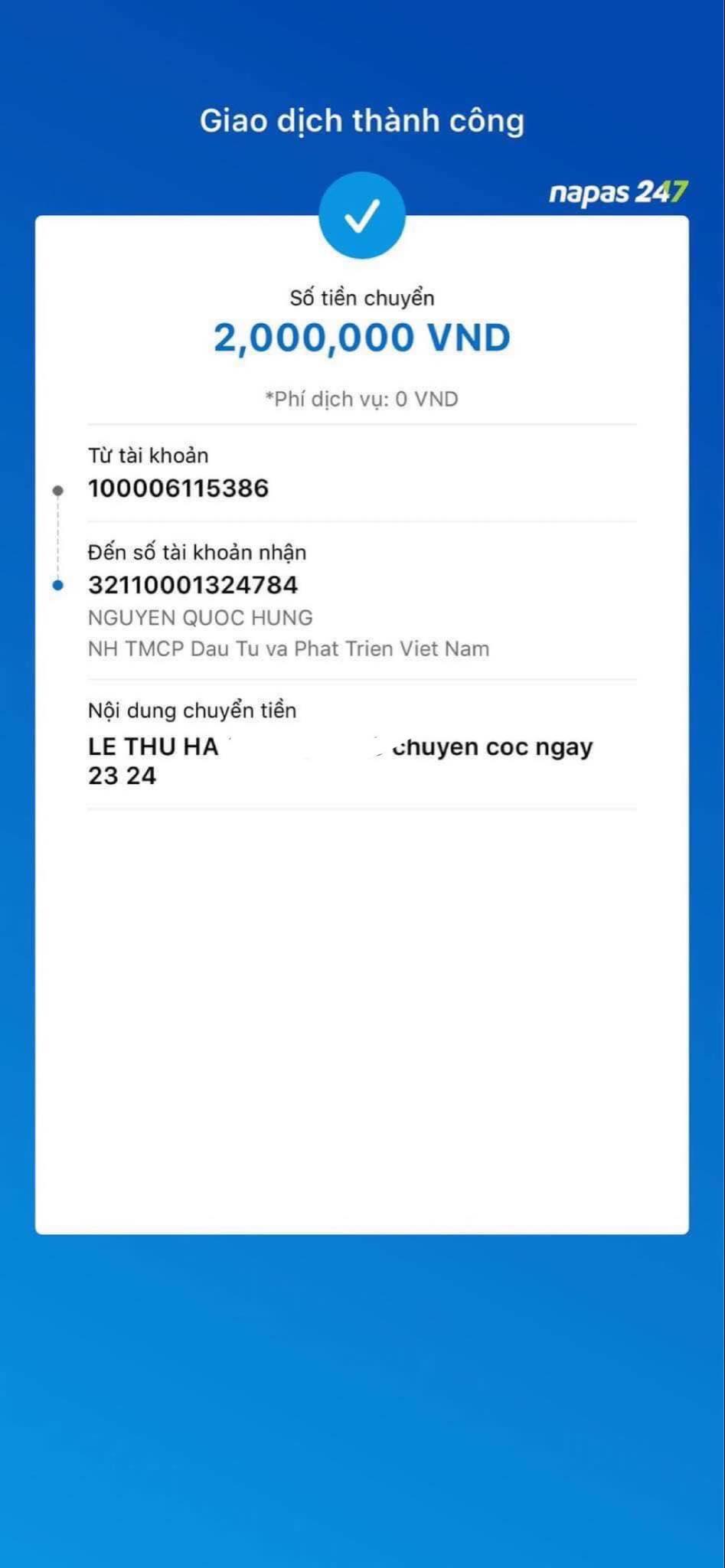 "Khi thấy họ nhanh chóng cung cấp giấy tờ liên quan, điện thoại liên hệ của quản lý, mình có tâm lý chủ quan. Cộng thêm việc tư vấn viên thúc giục nên mình ham rẻ, nhanh chóng nói chị gái chuyển 2 triệu đặt cọc cho chủ tài khoản Nguyễn Quốc Hùng", anh Việt cho biết.