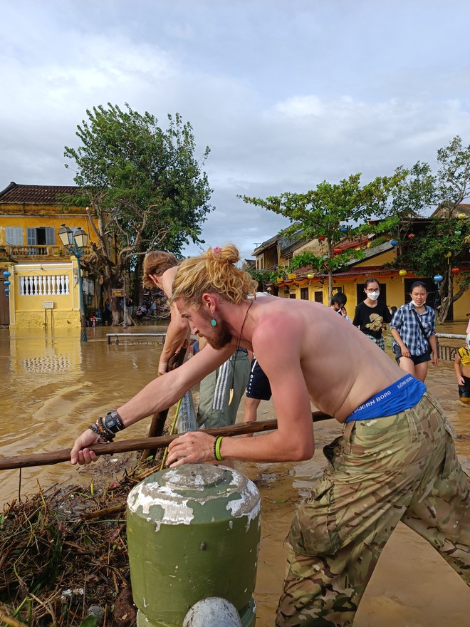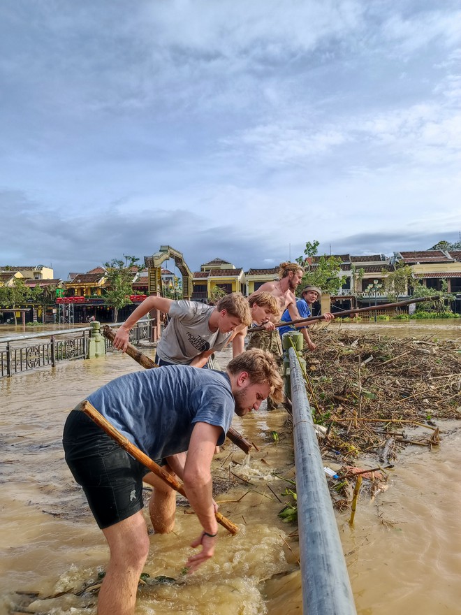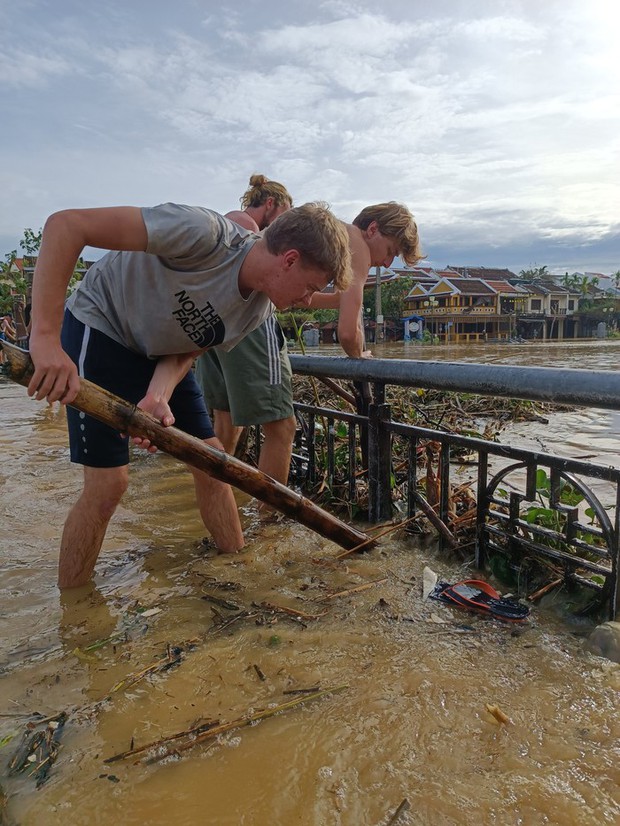 Trong số đó, không ít người ấn tượng với hình ảnh một nhóm khách du lịch ngoại quốc hì hục dọn rác, khai thông dòng lũ đang chảy qua một cây cầu bắc ngang sông Hoài (một nhánh sông chảy trong lòng phố cổ Hội An).