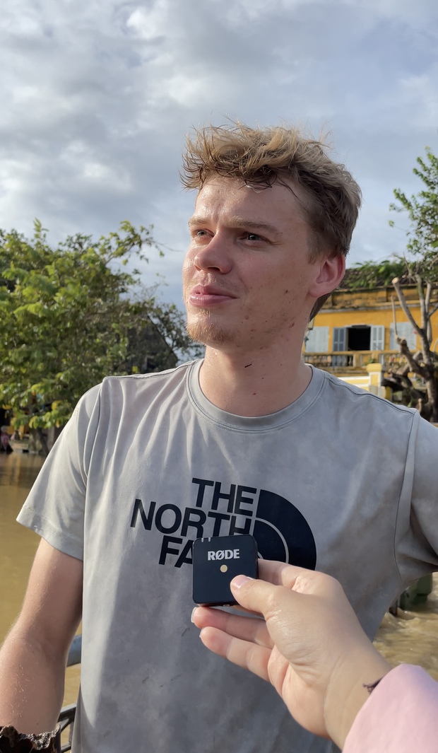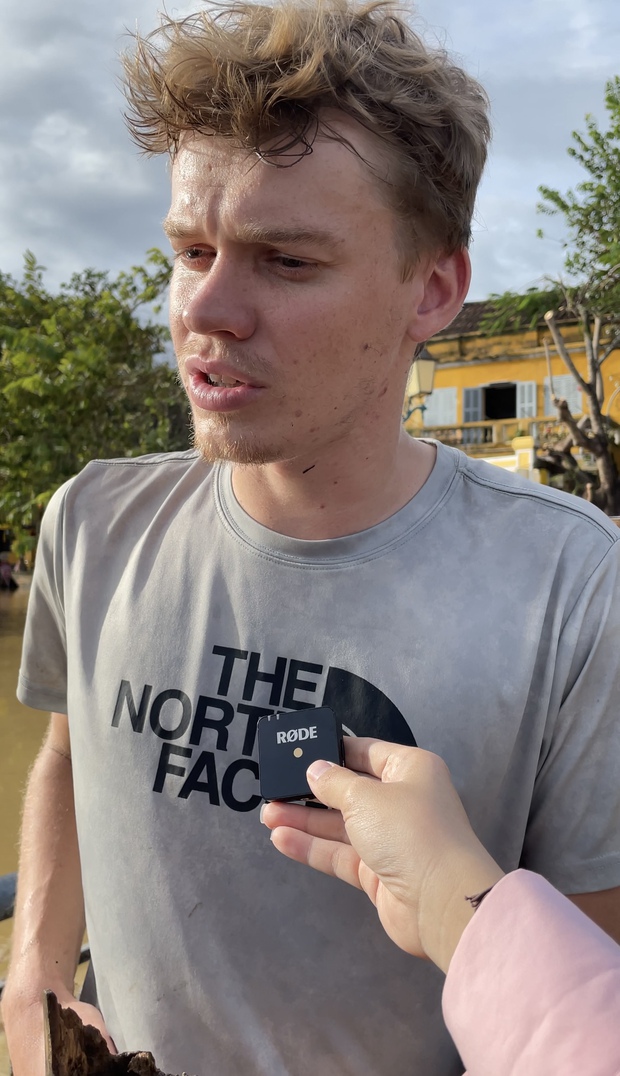 Trao đổi với chúng tôi, anh Max Devlieger (đến từ Bỉ) chia sẻ: "Chúng tôi đến miền Bắc, sau đó định ghé thăm miền Trung và miền Nam thì gặp bão. Việt Nam là một đất nước xinh đẹp, người dân rất tốt bụng nên chúng tôi muốn góp một chút sức để giúp cho thành phố quay trở lại xinh đẹp như cũ. Với chúng tôi, đây là lần đầu tiên được trải nghiệm một cơn bão lớn như vậy. Tôi sống ở Bỉ, ở đó chúng tôi không có bão hay những thứ tương tự như vậy. Chúng tôi muốn giúp đỡ người dân Việt Nam vượt qua cơn bão này".