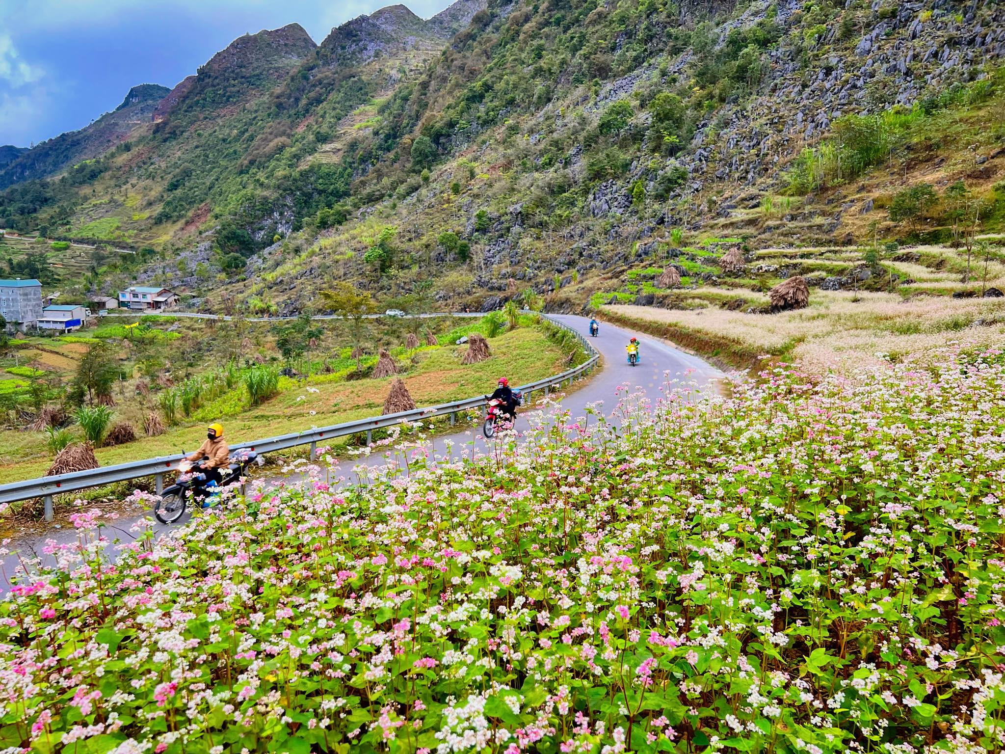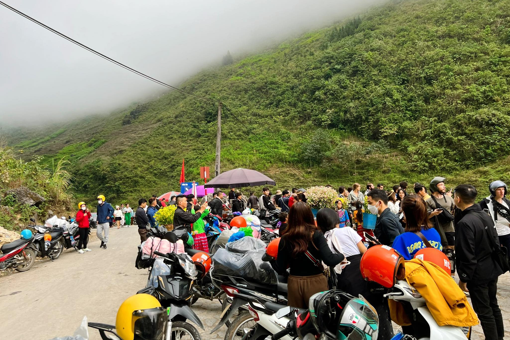 Không chỉ khách nội địa, Hà Giang mùa tam giác mạch thu hút cả lượng lớn khách quốc tế ghé thăm. Trong dịp cuối tuần, những con đường đi tới các địa điểm nổi tiếng của Hà Giang đều diễn ra tình trạng chất cứng phương tiện di chuyển.