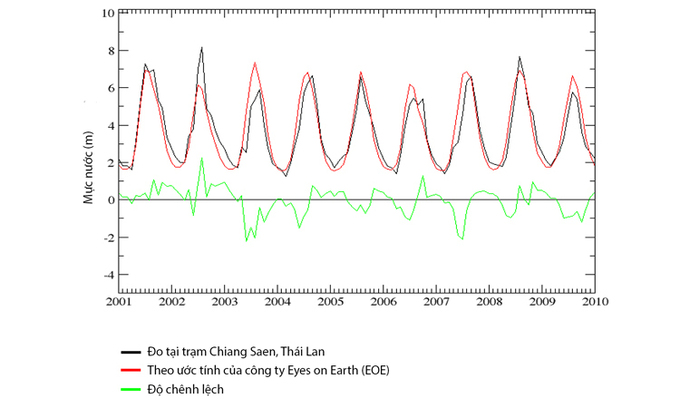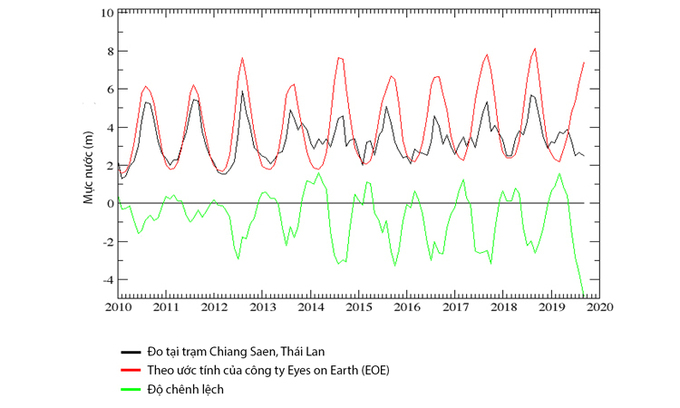 Theo Basist, EOE, được Bộ Ngoại giao Mỹ tài trợ, đã sử dụng dữ liệu từ vệ tinh để ước tính dòng chảy tự nhiên của sông Mekong từ 1992 đến 2019. Sau 28 năm, EOE tính toán mực nước của dòng Mekong giảm gần 127 m. Đường màu đen là lượng nước thực tế đo được tại Chiang Saen, đường màu đỏ là lượng nước ước tính của EOE. Chiang Saen là trạm đo thủy văn do Ủy hội sông Mekong (MRC) lập ra từ 1960, đặt tại tỉnh Chiang Rai, phía bắc Thái Lan. Dữ liệu tại trạm đo Chiang Saen do MRC cung cấp cho EOE.