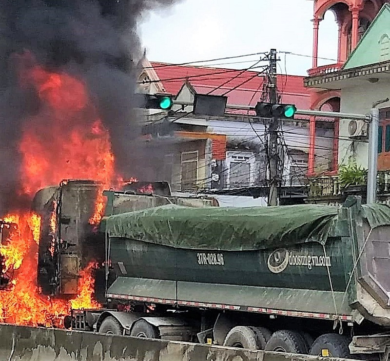 Ngọn lửa nhanh chóng bao trùm, thiêu rụi phần đầu xe chỉ trong chốc lát. Rất may tài xế đã kịp thời thoát ra ngoài an toàn.