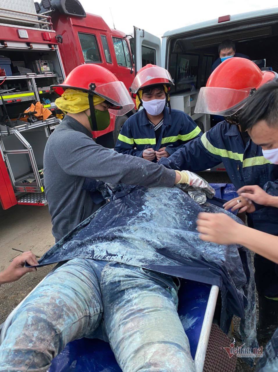 Lực lượng cứu hộ phải dùng xe cẩu đỡ phần đầu xe tải. Sau hơn một giờ, tài xế đã được đưa ra khỏi cabin.