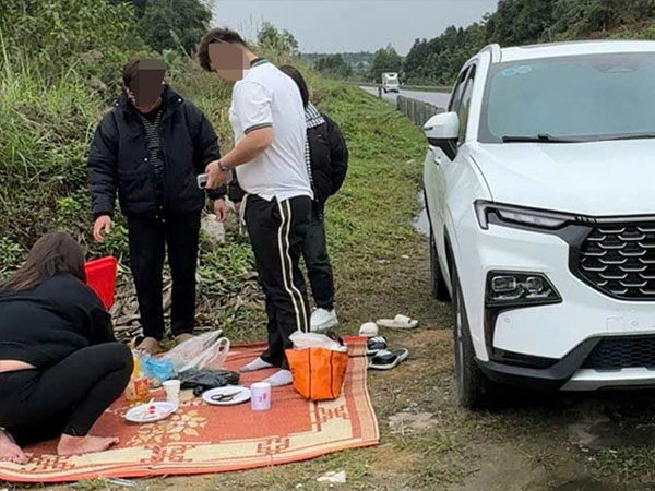 03/02/2025 20:57Dừng xe trên cao tốc 2 làn, trải chiếu bên lề đường ăn uống