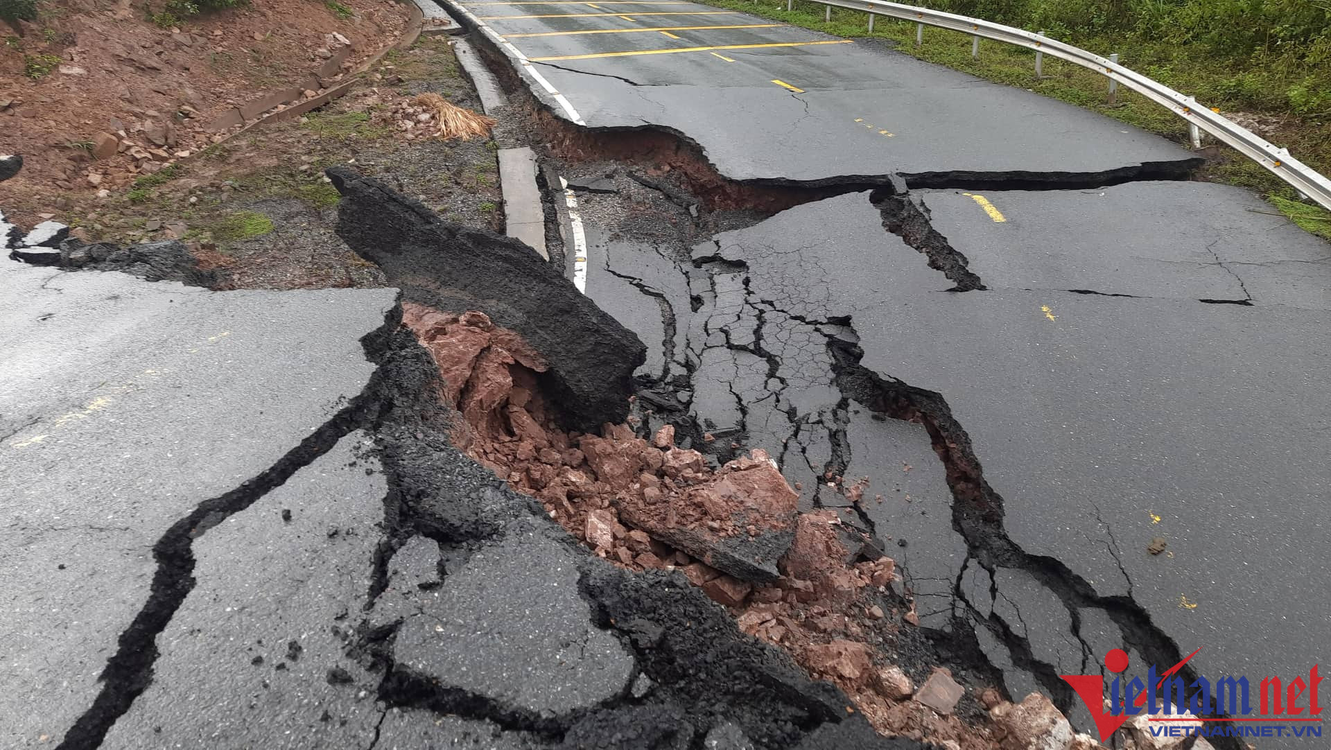 Đến sáng nay, do ảnh hưởng của mưa lũ, các vết sạt lở vẫn tiếp tục diễn biến phức tạp khiến toàn khu vực đứt gãy trên đã sụt lún xuống phần ta luy âm hoàn toàn. Một phần quả đồi cũng sụt sâu khoảng 7m.