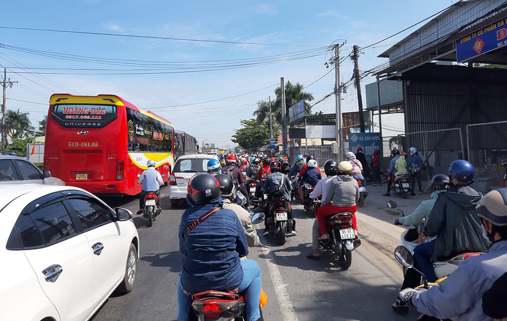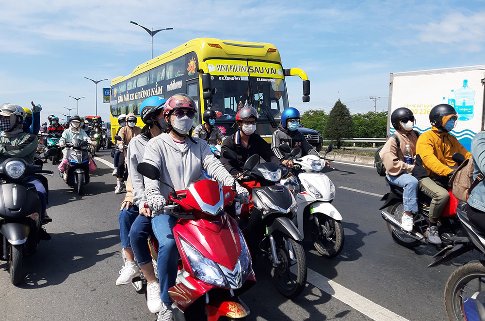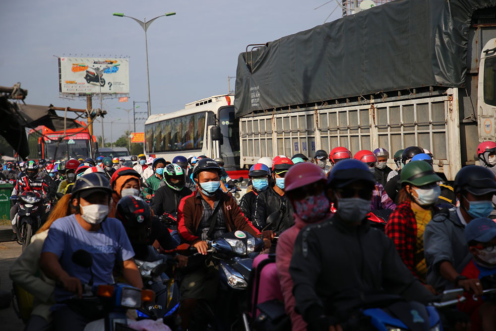 Trên quốc lộ 1 đoạn qua thị xã Bình Minh (Vĩnh Long), hàng nghìn xe ken đặc, nối đuối nhau, di chuyển chậm theo hướng từ miền Tây đi TP.HCM.