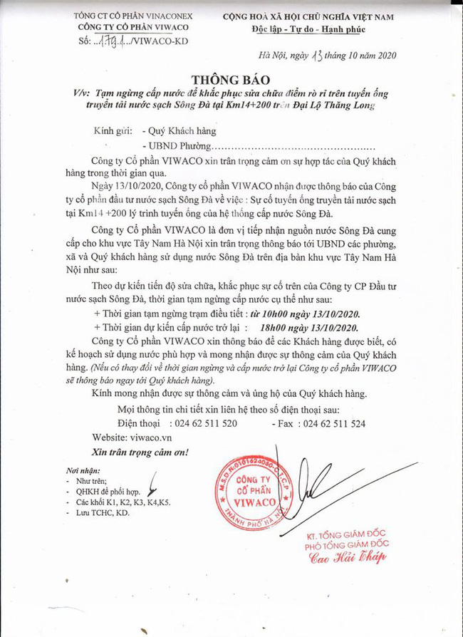 Để khắc phục sự cố, Công ty CP Đầu tư Nước sạch Sông Đà sẽ tạm ngừng cấp nước từ 10h ngày 13/10 thời gian dự kiến cấp nước trở lại là 18h ngày 13/10/2020.