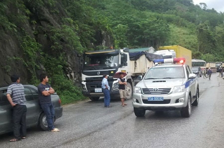 Va chạm xảy ra đúng đoạn đường cua và rất hẹp nên hàng chục chiếc xe khác từ cửa khẩu Cha Lo về xuôi bị tắc hàng kilomet - Ảnh: Xuân Huy |