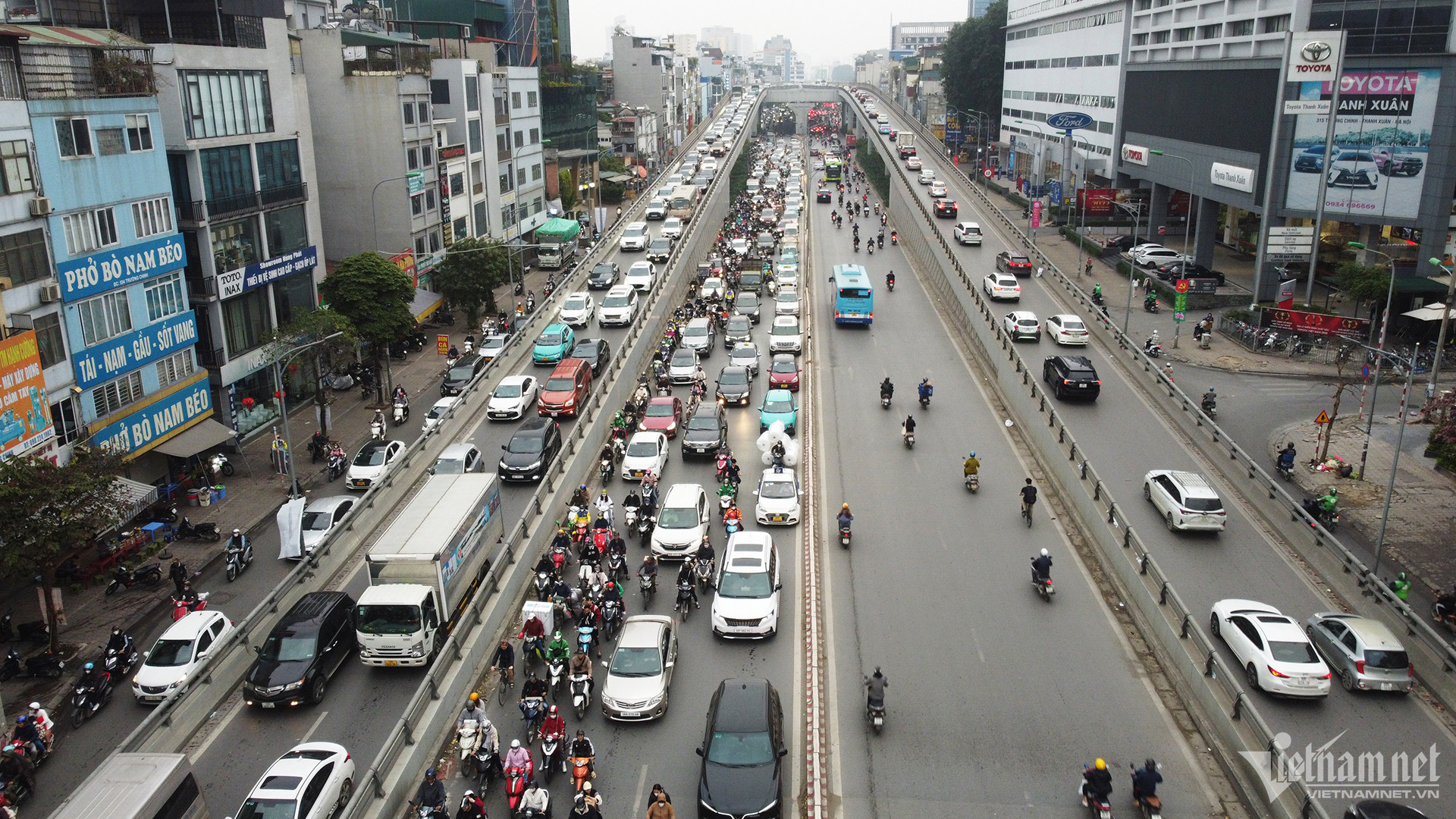 Ghi nhận của VietNamNet vào 16h chiều cùng ngày, tại đường Vành đai 3 trên cao (đoạn qua nút giao Nguyễn Trãi - Khuất Duy Tiến), tình trạng ùn tắc vẫn diễn ra. Tài xế nhích từng mét để di chuyển trên tuyến đường này.