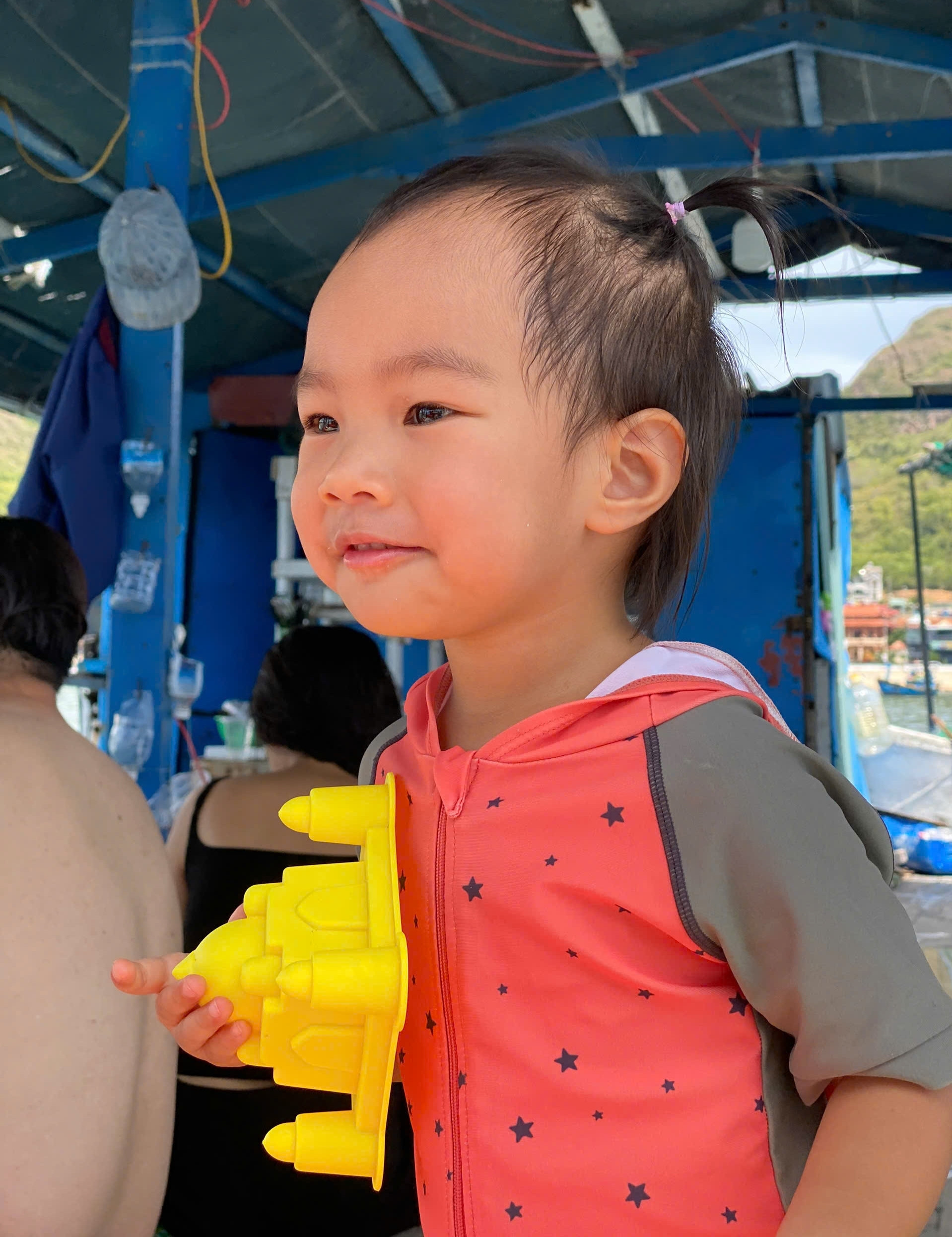 Ông bố 9X tiết lộ thường cho Mộc Trà đi lặn ở vùng biển Nhơn Hải. Bé có khả năng nín thở tốt và mỗi lần xuống nước sẽ lặn được khoảng 15 – 25 giây.