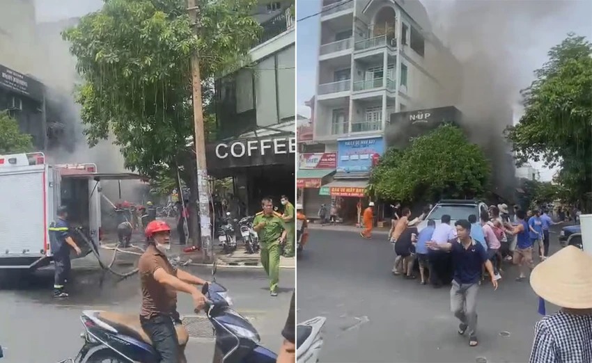 Lửa bốc cao, lan ra ở các cục nóng máy lạnh, biển hiệu và bốc khói dữ dội, uy hiếp một xe bán tải dừng đỗ gần đó.