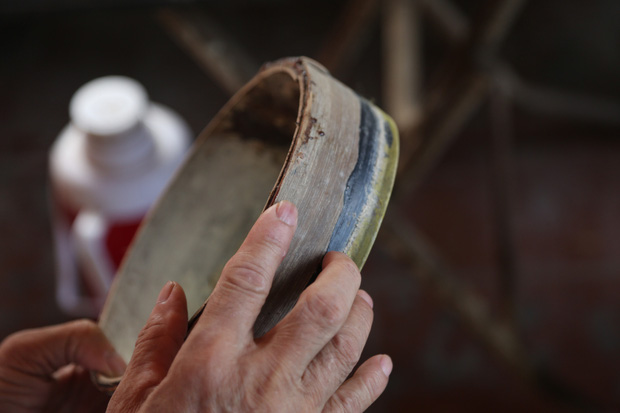 "Chiếc khung được làm từ cây song, tước thành sợi nhỏ, dài rồi dùng máy móc ép lại thành khung mũ nên có độ bền cao và vô cùng nhẹ. Nếu không phải người làm nghề thì sẽ tưởng là gỗ nhưng cầm vào sẽ thấy rất nhẹ", ông Tề chia sẻ.