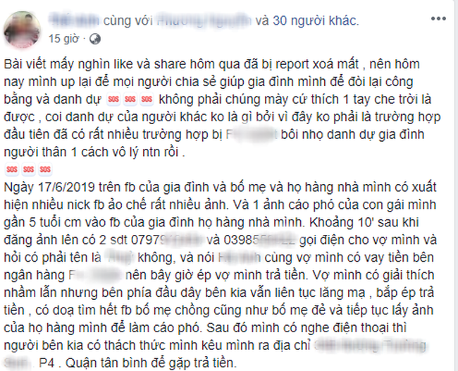 Cụ thể trong ngày 17/6/2019, tài khoản facebook của T.A cũng như họ hàng và người thân xuất hiện nhiều nick ảo chế ảnh lăng mạ, bôi nhọ danh dự của gia đình. Đáng nói hơn là trong đó có một tấm ảnh cáo phó dùng hình ảnh con gái mới 5 tuổi của T.A, đi kèm những lời lẽ ác ý "lý do chết vì mẹ mượn nợ không trả nên con bị quả báo".