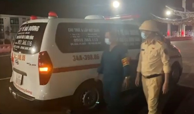 Tối 26/6, Đội tuần tra kiểm soát giao thông đường bộ cao tốc số 2 (Cục CSGT) làm nhiệm vụ tại chốt kiểm dịch trước Trạm thu phí đầu cầu Bạch Đằng, trên cao tốc Hà Nội - Hải Phòng - Quảng Ninh, phát hiện một xe cứu thương BKS: 34A 389-86 không dừng khai báo y tế.