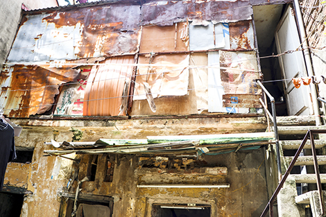 "Căn nhà" giống như một túp lều xập xệ. Bên ngoài lợp bằng nhiều lớp tôn rỉ hoen, thủng lỗ chỗ đặt chồng lên nhau, đôi chỗ "gia cố" bằng vỏ bao gạo. Cầu thang dẫn lên nhà được xây bằng xi măng, đổ dốc thẳng đứng 90 độ, chắc để tiết kiệm diện tích, rêu xanh rêu nâu bám quanh. Ở bên dưới vẫn là nhà vệ sinh và khu phơi phóng quần áo chung của cả khu.