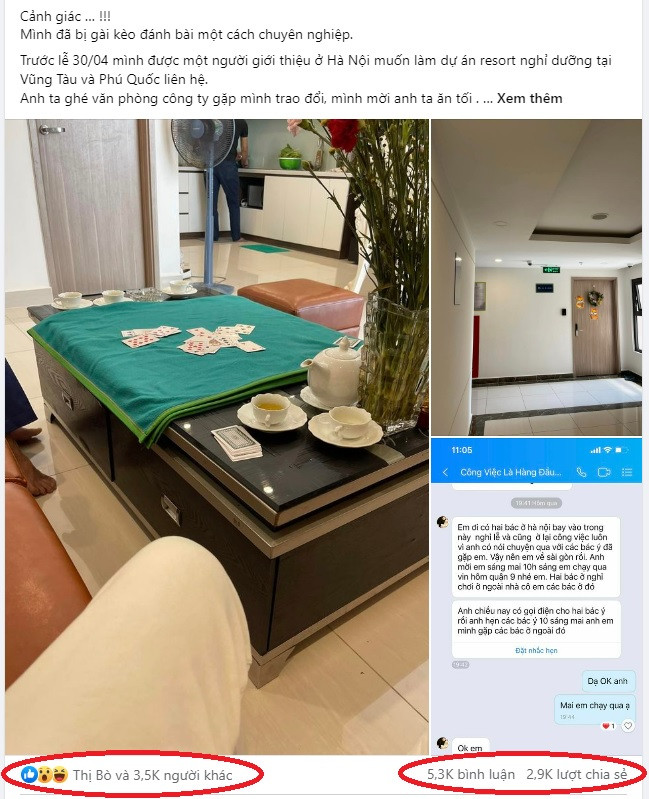 Không dụ được anh Khim chơi bài, nhóm người này đuổi anh Khim về. Khi về nhà, anh đăng bài kể lại câu chuyện lên Facebook cá nhân để cảnh báo mọi người tránh sập bẫy lừa đánh bài chiếm đoạt tài sản.