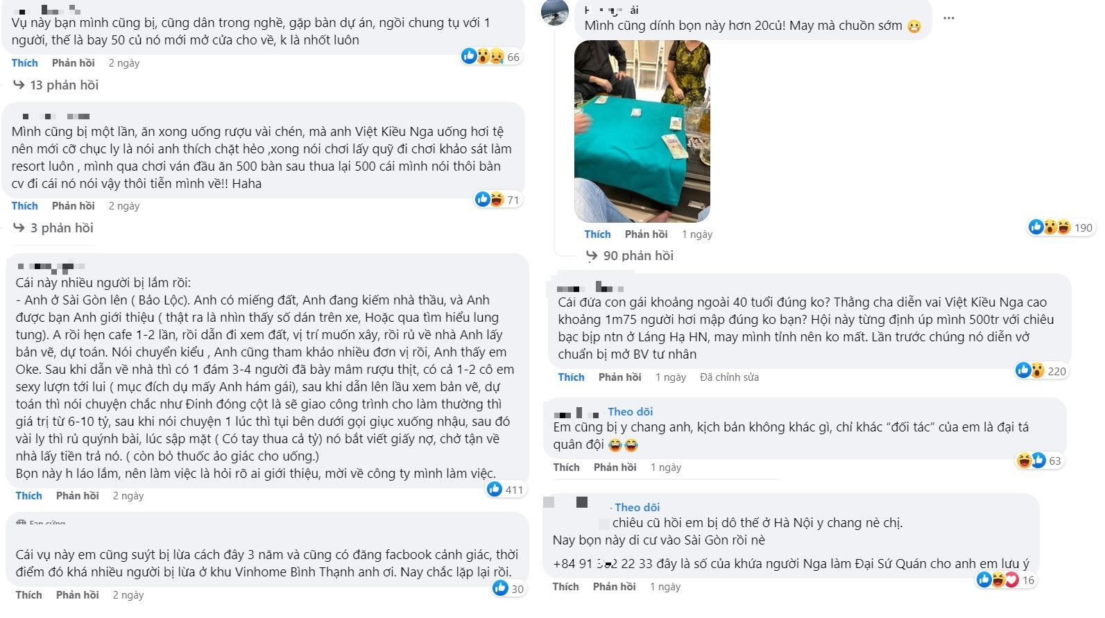 Qua trao đổi với phóng viên VietNamNet, 9 nạn nhân kể lại câu chuyện thua bài mất tiền cho nhóm người lạ mặt. Chung một kịch bản lừa, trong nhóm có người tự giới thiệu là quan chức, Việt kiều Nga, cán bộ cấp cao, sĩ quan quân đội... có nhu cầu đầu tư kinh doanh.