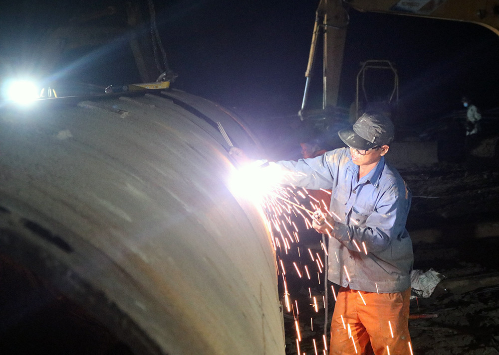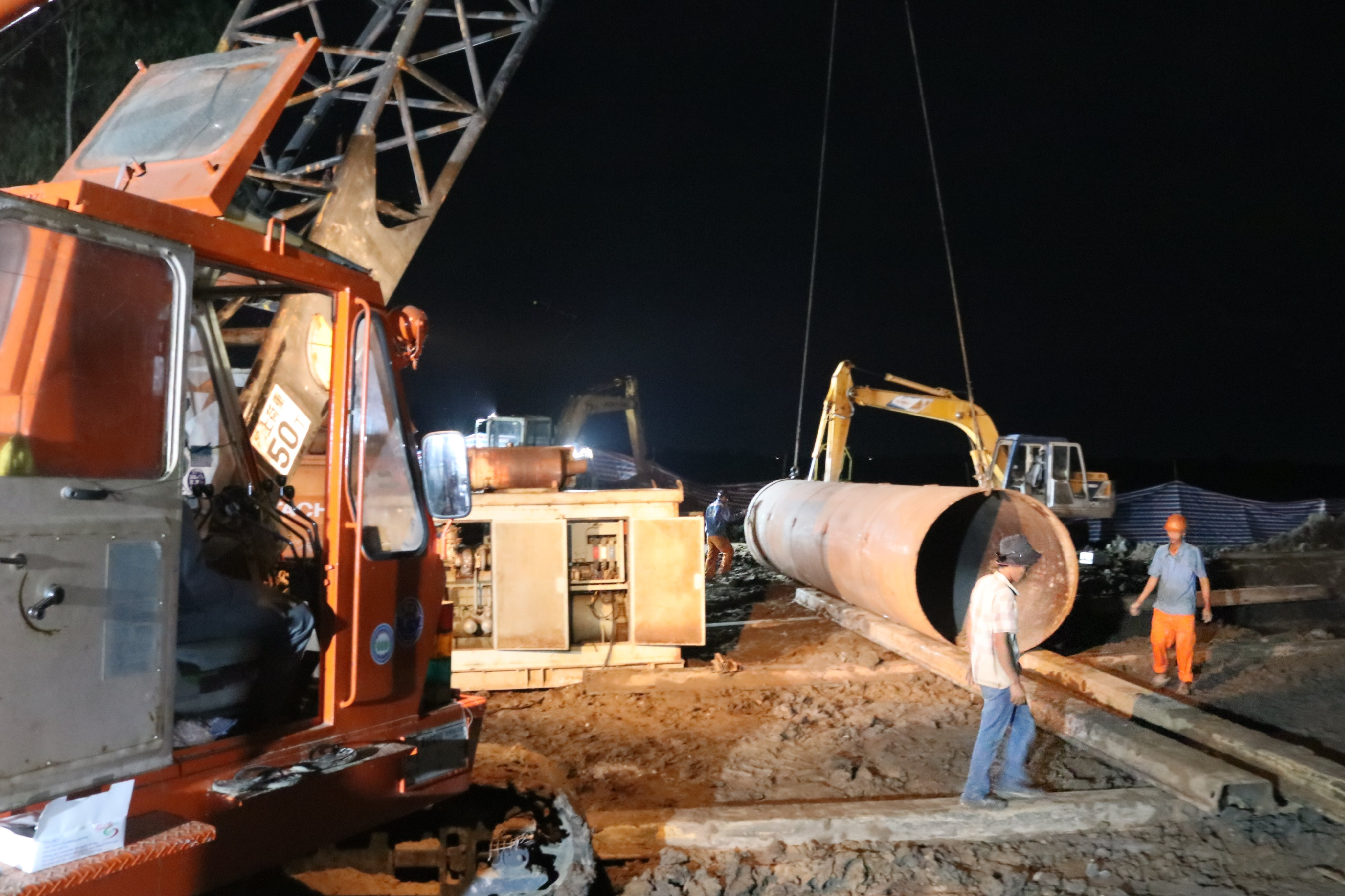 Đến khoảng 3h sáng, lực lượng cứu hộ sử dụng một ống thép đường kính 1,5m đặt xuống bao quanh ống trụ bê tông mà cháu bé rơi lọt vào.