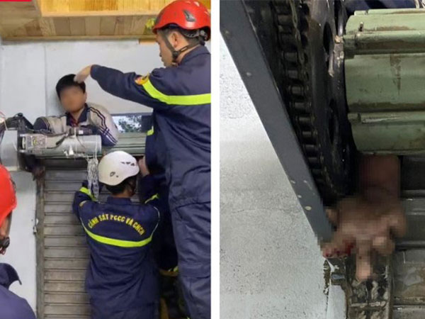 Tại hiện trường, tay trái của cháu bé bị kẹt sâu phần góc cửa cuốn, gần sát khu vực bánh răng dây xích. Vị trí cháu bé được phát hiện mắc kẹt nằm phía bên trên cửa cuốn, gần với trần nhà, thông tin trên báo Dân Trí.