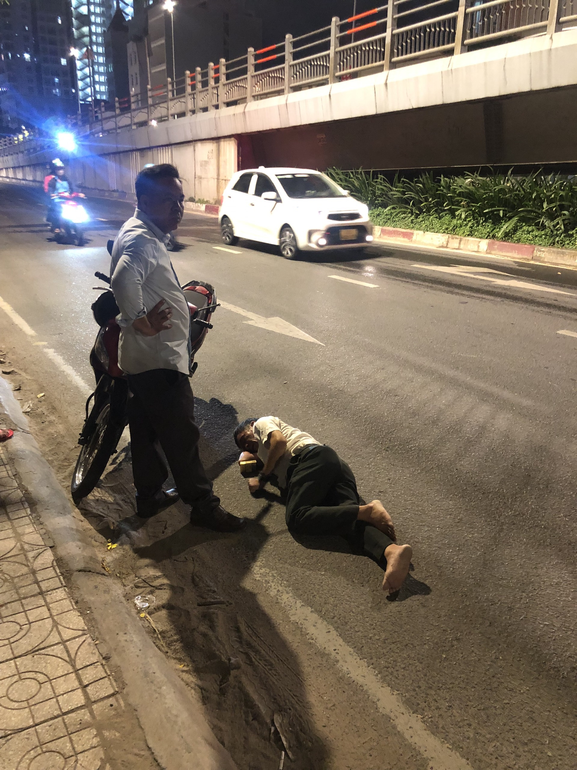 Khuya 3-6, nhiều người di chuyển trên đường Cộng Hòa (gần cầu vượt Hoàng Hoa Thám, thuộc phường 12, quận Tân Bình) bắt gặp người đàn ông nằm bất động trên đường, ngay cạnh chiếc xe máy.