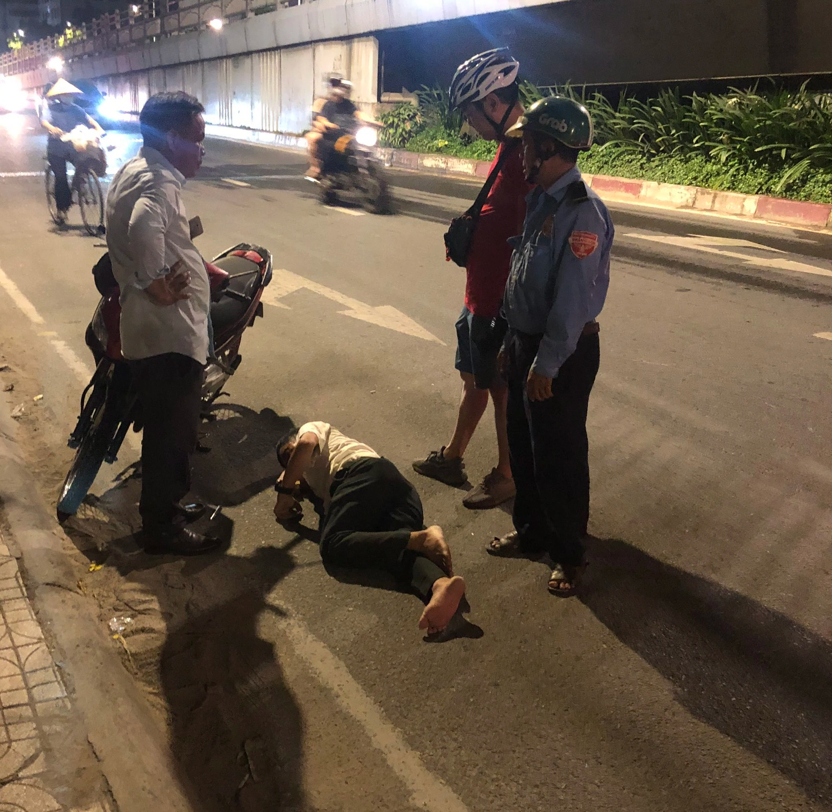 Nhiều nhân chứng cho biết vào khoảng 22 giờ cùng ngày, một người đàn ông khoảng 60 tuổi đang lưu thông trên đoạn đường này bằng xe máy thì bất ngờ ngã xuống. Sau khi ngã xuống đường thì người đàn ông này cũng nằm ngay tại chỗ mà không tự đứng dậy được.