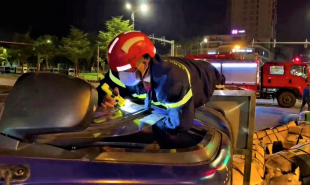 | Toàn cảnh giải cứu tài xế mắc kẹt trong cabin do vụ lật xe ở cầu Rồng |