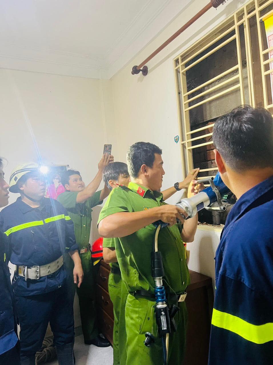 Cảnh sát đã triển khai đội hình banh cắt thuỷ lực và đội hình cứu nạn, cứu hộ bằng dây để giải cứu thành công nạn nhân từ ô cửa sổ ở tầng 3 phía sau căn nhà số 107 đường Ngô Quyền.