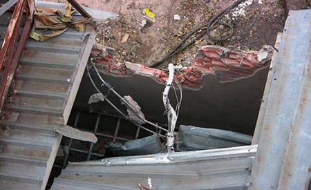 Mảng tường trên nóc ngân hàng bị thủng. Ảnh: Hải Hiếu |