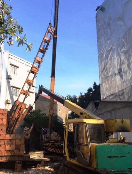 Hệ thống ép cọc bêtông nặng 10 tấn, dài hơn chục mét lật ngang vào nóc ngân hàng gây thủng một lỗ lớn khiến nhiều người hoảng loạn.