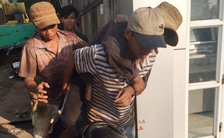 Nam công nhân bị mắc kẹt trong giàn ép cọc, bị thương. Nhiều người hô hoán tìm cách tháo dỡ vật liệu, giải cứu nạn nhân đưa đi cấp cứu.