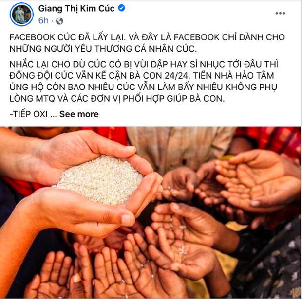 Sau khi tuyên bố sẽ chặn hết những cư dân mạng vào trang cá nhân spam hoặc nhắn tin thô tục, chị Giang Kim Cúc cũng cho biết có 2 việc mà cô cần làm để chứng minh bản thân mình trong sạch và minh bạch trong việc làm thiện nguyện.