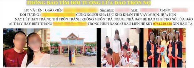 “Chúng gọi điện vào số điện thoại của trường, gửi email cho cả Sở Giáo dục và Đào tạo khiến tôi rất lo lắng. Tôi đã làm đơn trình báo công an cũng như trình bày với lãnh đạo trường. Tuy vậy, chúng vẫn quấy nhiễu suốt ngày lẫn đêm khiến tôi khủng hoảng tinh thần. Chưa hết, chúng còn lấy hình ảnh cá nhân của tôi, gia đình và cả trường nơi tôi công tác để đăng lên mạng facebook”, chị T. nói. Bị làm phiền nhiều quá, chị T. yêu cầu gặp mặt trực tiếp thanh toán nhưng các đối tượng đòi nợ không chịu ra mặt, yêu cầu chuyển khoản.