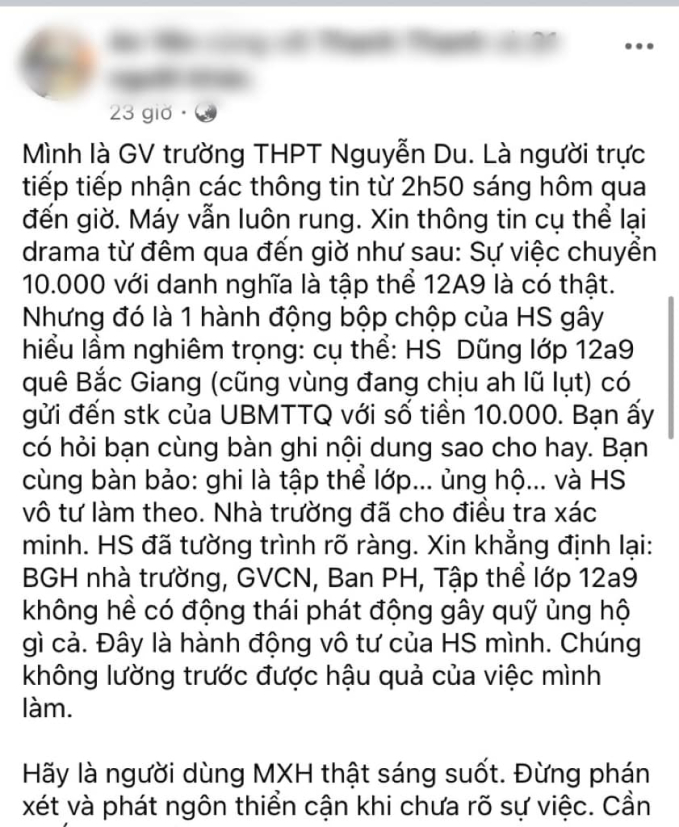 Theo bài đăng của các giáo viên trường THPT Nguyễn Du trên MXH thì một học sinh tên D. của lớp 12A9 đã chuyển khoản 10.000 Đồng để gửi ủng hộ đồng bào bị ảnh hưởng bởi bão lũ. Khi không biết nên chuyển khoản với nội dung như nào thì D. được một bạn gợi ý viết: "Tập thể lớp ủng hộ" và em cũng vô tư làm theo mà không hề lường trước hậu quả. Em D. sau đó cũng đã có tường trình rõ ràng với nhà trường về vụ việc.