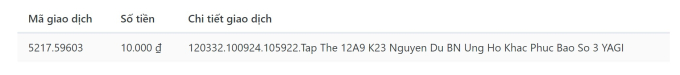 Mới đây nhất, một nội dung chuyển khoản cũng gây xôn xao mạng xã hội. Theo đó, một giao dịch 10.000 Đồng được chuyển đến tài khoản của MTTQ với nội dung "Tập thể 12A9 K23 Nguyễn Du BN (PV: Bắc Ninh) Ủng hộ khắc phục bão số 3 Yagi".