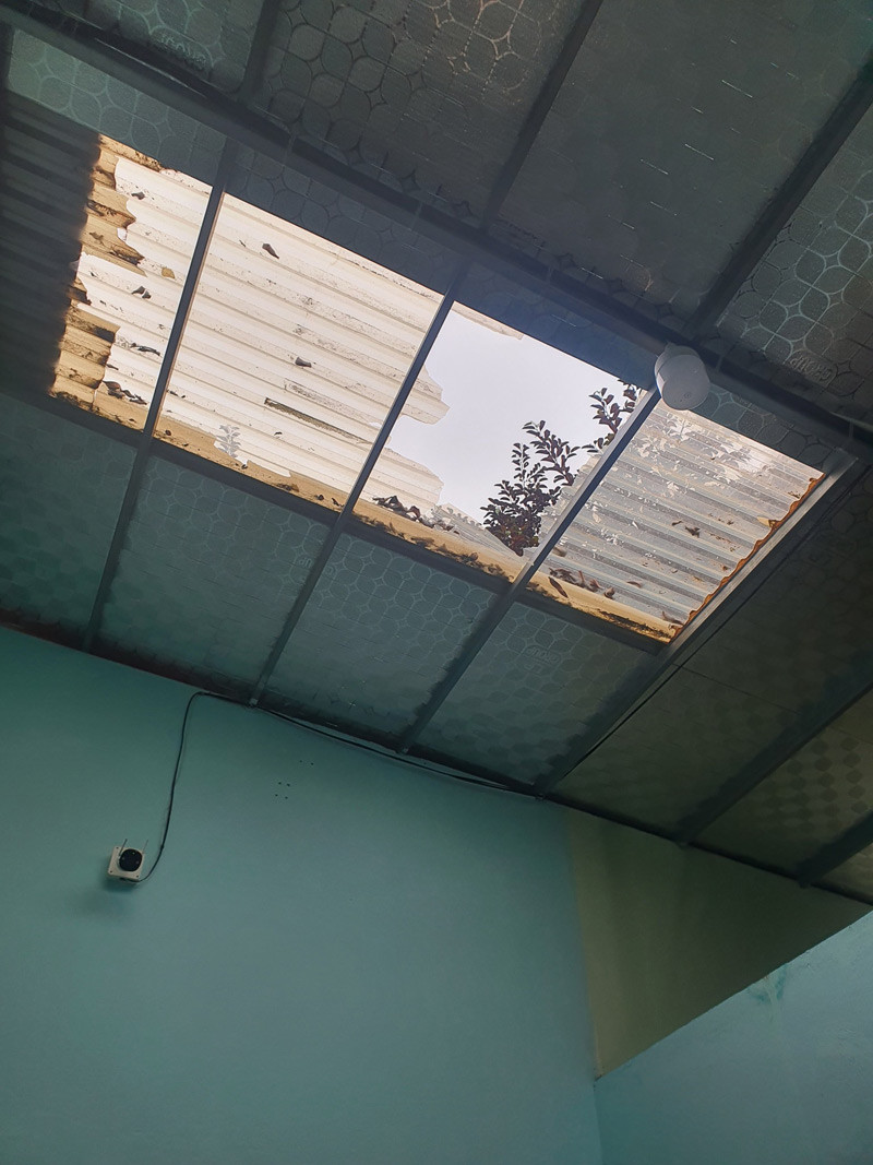 Khoảng 15h30 ngày 4/2, chị sang kho lấy hàng thì thấy mái nhà thủng một lỗ lớn, bên dưới la liệt các mảnh vỡ. Ban đầu chị tưởng nhà có trộm đột nhập nên đã cùng chồng kiểm tra camera.