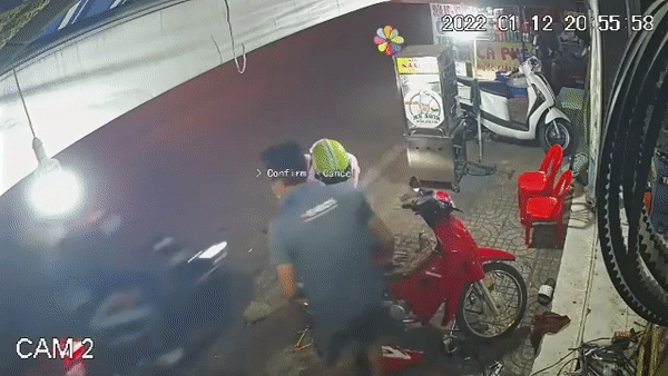 Theo hình ảnh trích xuất từ camera an ninh, thời điểm trên, một cô gái đang đứng trước cửa hàng sửa chữa xe máy. Lúc này, 2 thanh niên chở nhau trên xe máy tiến tới, áp sát rồi nhanh tay giật lấy túi xách của cô gái đang đeo trên vai.