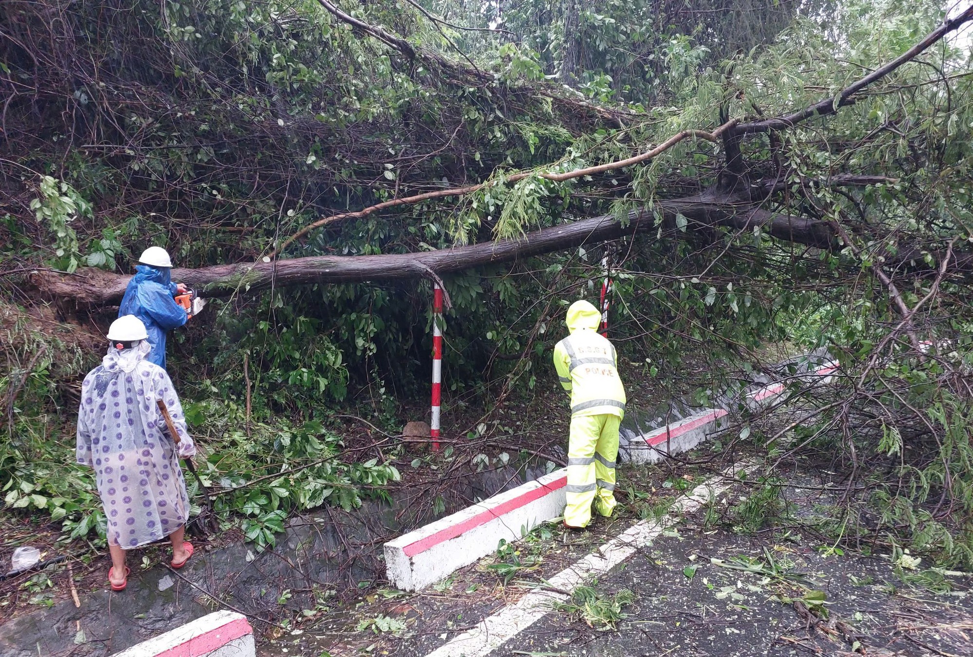 Tại tuyến đường đèo này đang có mưa to, gió lớn, nhiều cây bị ngã đổ chắn ngang đường gây tắc đường ở phía Bắc Đèo Hải Vân.