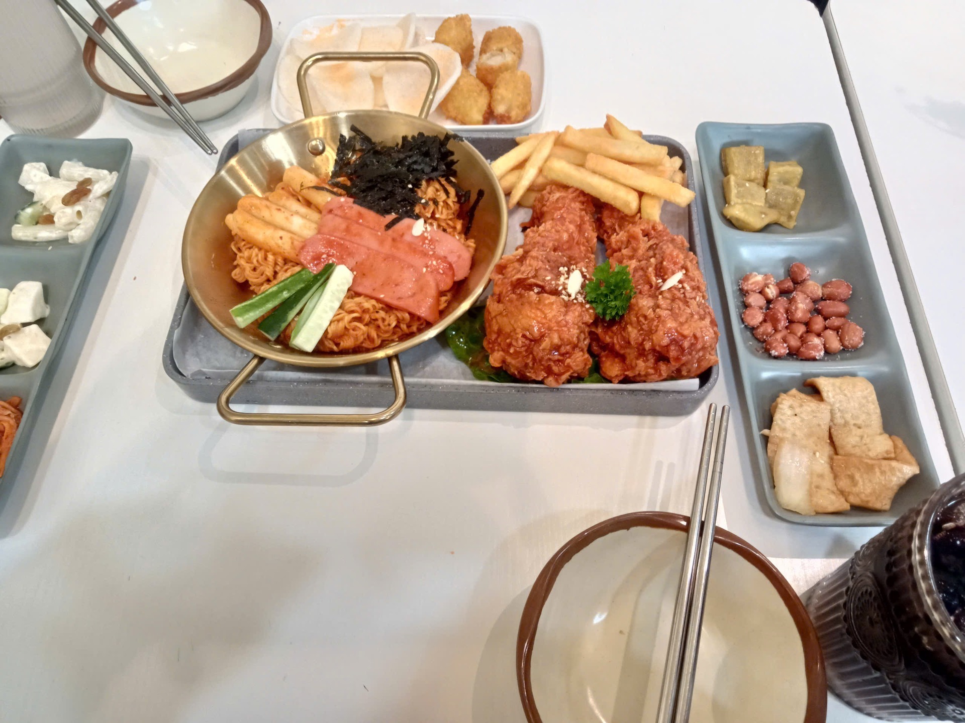 Hai vị khách order 1 set Okinawa, 1 phần kimbap và 1 suất tokbokki sốt carbonara sau đó lên tầng 4 ngồi chờ đồ ăn. Sau khoảng 10 phút chờ đợi, đồ ăn được mang lên gần đủ, chỉ còn thiếu 1 phần kimbap.