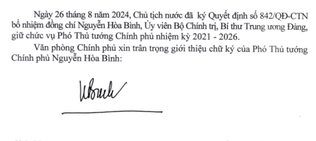 Văn phòng Chính phủ trân trọng giới thiệu chữ ký của Phó Thủ tướng Chính phủ Nguyễn Hòa Bình: