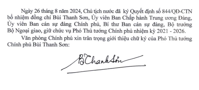 Cùng ngày 26-8, Chủ tịch nước đã ký Quyết định số 844 bổ nhiệm ông Bùi Thanh Sơn, Ủy viên Trung ương Đảng, Ủy viên Ban cán sự đảng Chính phủ, Bí Thư Ban cán sự Đảng, Bộ trưởng Bộ Ngoại giao, giữ chức vụ Phó Thủ tướng Chính phủ nhiệm kỳ 2021-2026.