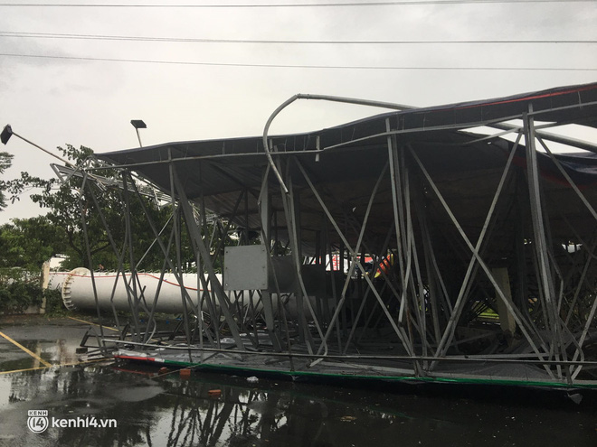 Có thể thấy những cơn lốc mạnh đã thổi bay cả những mái tôn được dựng chắc chắn ở bến xe, cây cối xung quanh cũng đổ rạp. May mắn đa phần những mái tôn bị lật rơi xuống bãi đất trống phía sau không có người, nhiều mảnh nhỏ bị thổi bay lên trời.